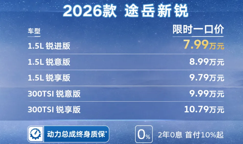 德系车在国内一直拥有较大的市场占有率,大众、奥迪、奔驰等品牌都是热销的品牌。如果预算10万以下,想买一台德系品质的SUV,可以看看大众途岳。大众可以说非常懂国人了,这台紧凑级SUV拥有非常运动的外观,并且提供1.5L+6AT、1.5T+7DCT的选择,作为一款紧凑级SUV,它的百公里油耗分别是6.41L、5.7L,家用还是挺不错的。这款车比较适合年轻家庭用车,价格也不高,卖点就是皮实耐用,现在也都是只加92号油就行。不过,需要说明的是,途岳也有两个车型,途岳新锐和新途锐。不过这两个车现在都有挺大的优惠,就说途岳新锐这款车,2026款限时一口价7.99万起了(指导价12.59万起),提供动力总成终身质保的政策。新途岳限时一口价也仅仅是10.99万起(15.86万起),相当于降了5万左右吧。其实,1.5L+6AT的组合日常代步是能应付的,81kW的最大功率和141kW的最大扭矩,不要奢望去体验速度和激情,在路上超车的话,也需要打好提前量。但是,买这个动力组合的人,估计也不是为了去体验“加速感”的,是为了居家过日子的,买的就是一个踏实,保养成本低,用着顺手,上车就能走,稳稳当当的。加92号油,综合油耗6.41L。如果想体验更好的动力,1.5T+7DCT的组合,最大功率来到118kW,扭矩也来到250N·m,油耗也低到了5.7L,综合表现提升了,如果有必要的话,可以去选。不过,笔者还是更倾向于选1.5L的组合,毕竟为了性价比考虑。途岳新锐的外观也挺运动,中庸里透着运动,从这一点来看,大众挺善于观察国人的,车头整体为宽体这款车的车上4355mm,轴距2651mm,说实话,作为紧凑级SUV,这个尺寸不占优势,后排的空间也不是那么充裕,好在得房率还是可以的,如果不是特别高大的身材坐后排肯定是没问题。如果是平时拉个货啥的,后排座椅能4:6的比例放倒,后备箱常规是445L,拓展后空间能达到1443L,这样一来,载物空间还可以。这款车还提供了多种车色,比如月光白、盐系灰、朝气粉、活力蓝,车头还有横向大熏黑饰板,配合LED大灯组,酷黑运动尾翼、行李架、运动轮毂,还是挺好看的。从内饰看,整体依然延续了之前的设计风格,整体的设计很规整,没有那些花里胡哨的设计,并且在中控下方还有很多的物理按键,实用又简单。这款车还提供了三种座椅,比如有织物座椅、皮革织物搭配、皮革座椅等,怎么说说呢,织物的透气好,皮质的好打理。智能配置这一块,提供8英寸、9.2英寸的中控屏幕,还能和苹果、安卓、华为等多品牌手机进行互联,高配车型还可以提供语音控制功能、给了10.3英寸液晶仪表、15W的手机无线充电等,还提供了很多的主动安全预警配置,比如疲劳驾驶等。入门级的就够用了,追求更高的配置,预算充足的情况下可选。途岳延续了德系的品质,在看不见的地方,诸如拥有高刚性车身、耐久的防腐工艺等,还保留了德系的操控性能,推荐的1.5L的动力,耐用,保养又便宜。途岳是一款热销的SUV,在1月份卖出了13057辆。所以,认可度还是可以的,大家认为呢?