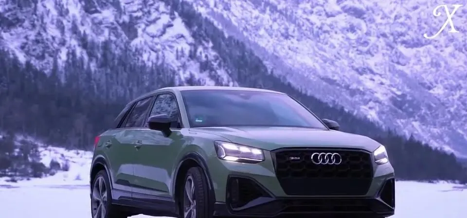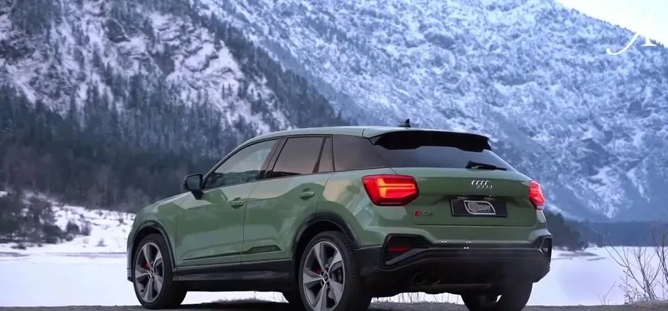 绿色奥迪SQ2在雪山背景下展示。