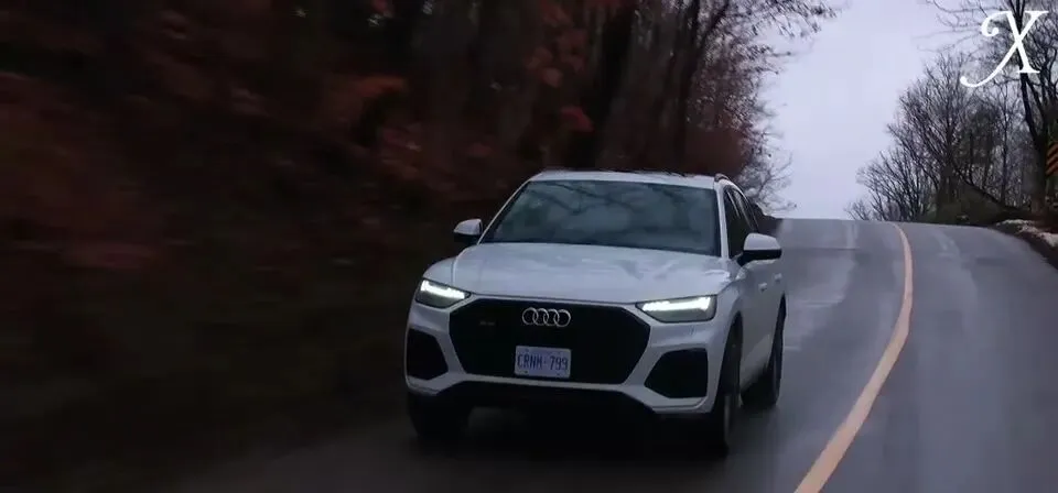 红色奥迪SUV正面行驶展示,外观时尚动感。