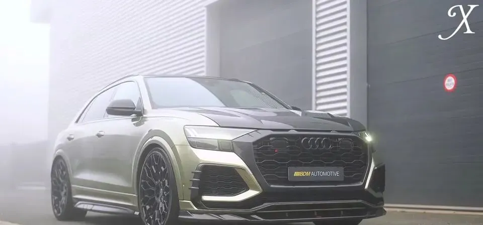 灰色奥迪SQ8在雾中展示。