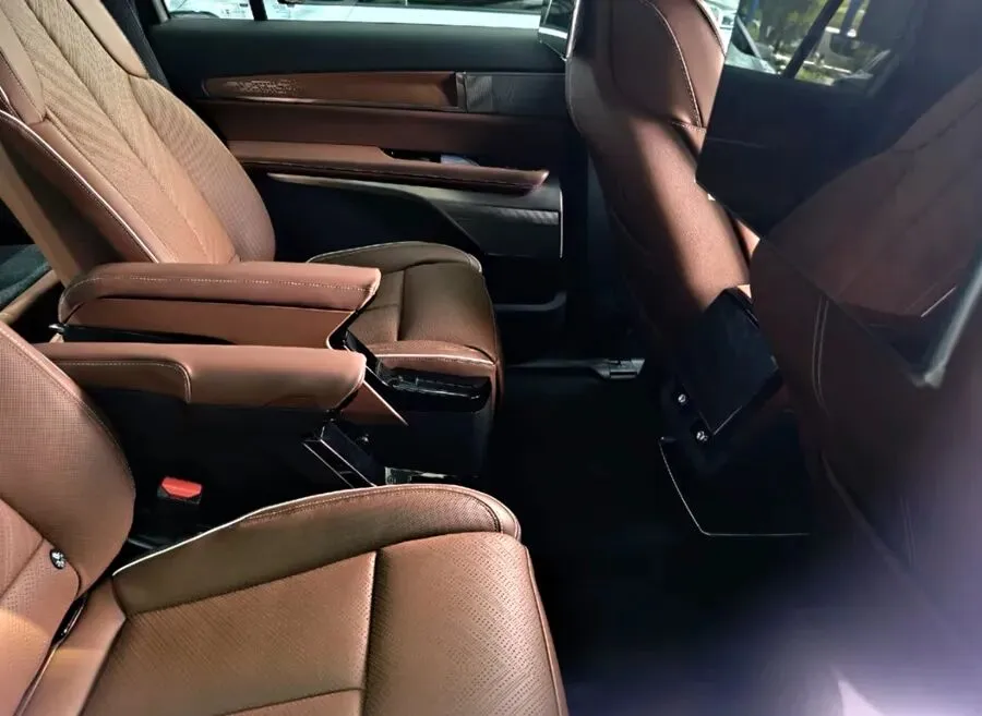 乘用性方面,作为一款相对标准化的大型SUV,其在具备5222/2026/1799mm车身三围的同时,还有着超3米(3094mm)的轴距,使其车内空间的充裕性不言而喻。此外,新车还将采用2+2+2的“大六座”布局,且从实拍图来看,其车内虽然没有配备后排吸顶娱乐屏,但给出了置于前排座椅后方的两块娱乐屏以及触控式空调面板的三屏联动设计,也算是为其车内增添了豪华格调。