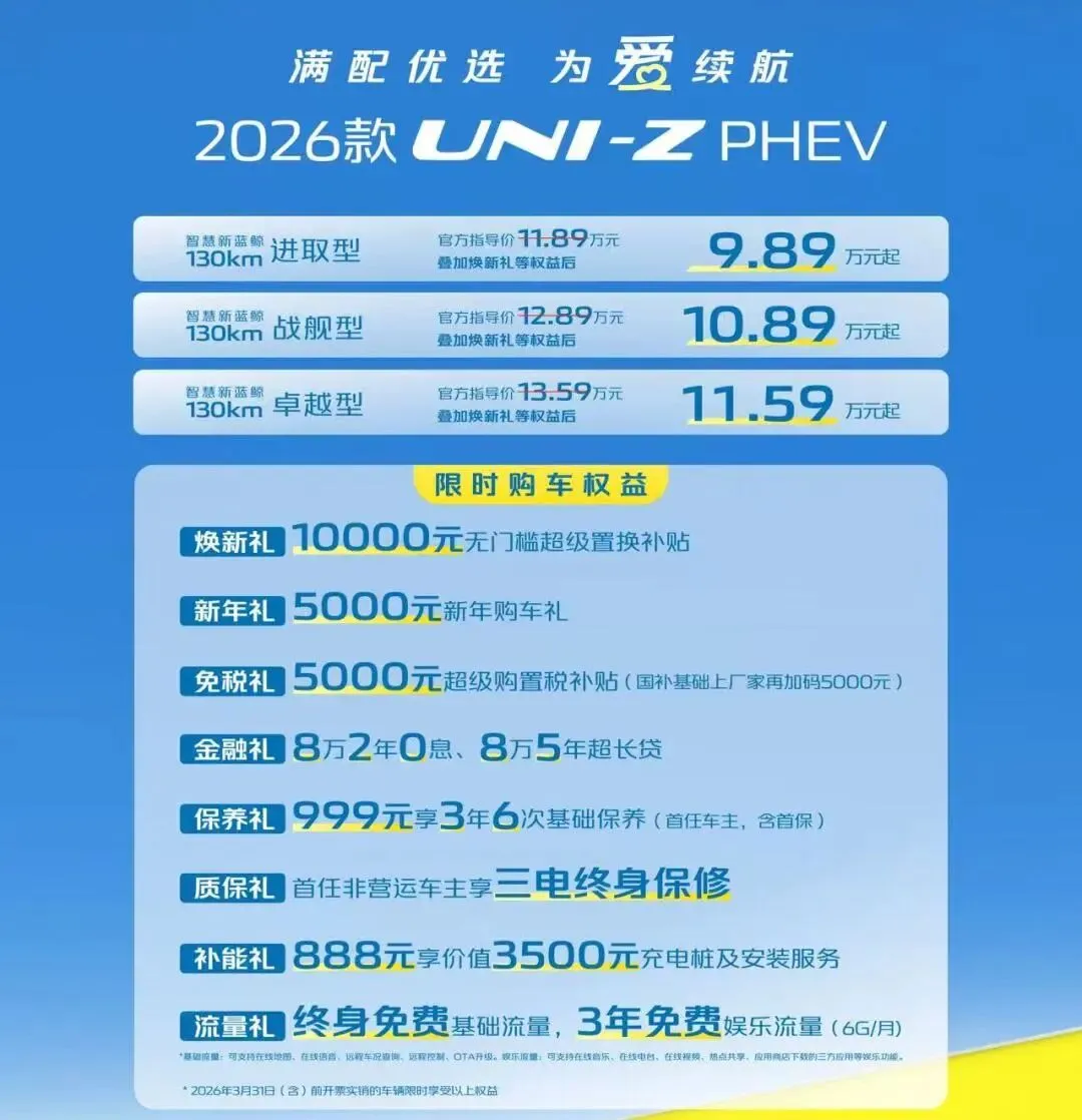 先说说最让人动心的价格和福利,2026款UNI-ZPHEV原本官方指导价11.89万起,叠加焕新礼、新年礼、免税礼等8重权益后,进取型仅9.89万起,战舰型10.89万,卓越型也才11.59万,这个价格买插混SUV,放在以前想都不敢想。而且福利全是实打实的:10000元无门槛超级置换补贴,旧车置换直接抵现;8万2年0息、8万5年超长贷,月供压力直接拉满;首任车主999元就能享3年6次基础保养,三电还终身保修;888元就能拿下价值3500元的充电桩+安装服务,连后期用车的成本都给你考虑到了。更别说终身免费基础流量、3年免费娱乐流量,日常用车的小开销全给包了,这波羊毛薅到就是血赚!外观内饰全面升级,10万级开出20万的质感