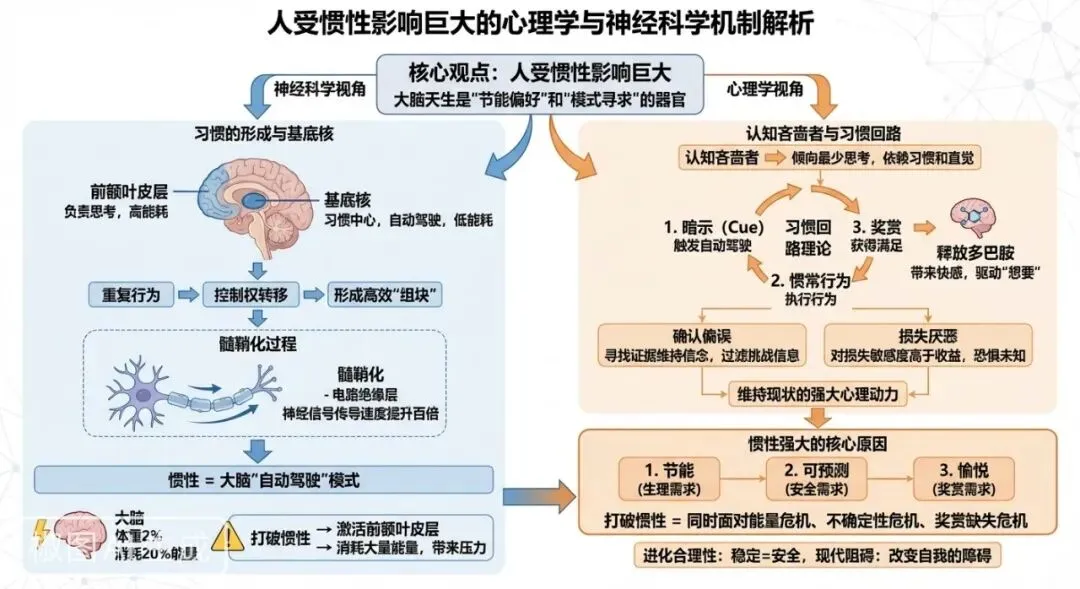 从神经科学的基底核到心理学的习惯回路,大脑天生就是个“节能主义者”,它偏爱用最少的能量处理重复的事、实现复利成长,这让我们在远古活了下来,却也在今天成了困住我们的舒适牢笼。
