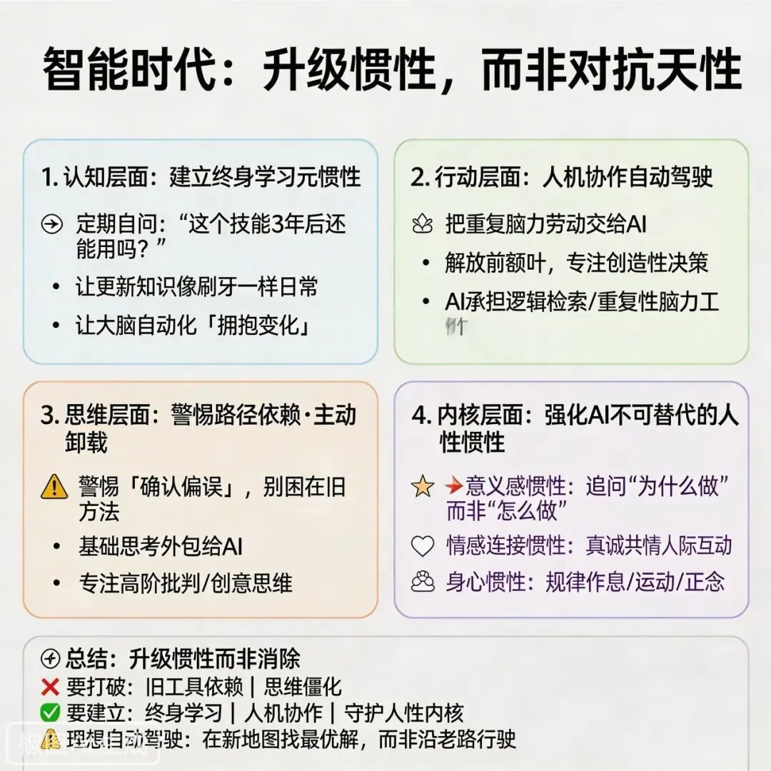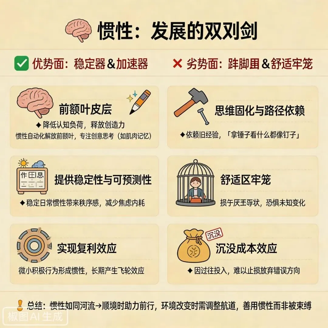 AI时代,我们不该和天性对抗,而是要学会今看懂惯性、升级惯性——把重复的脑力交给机器,把珍贵的前额叶留给创造与思考,让它成为你向前的助推力,而不是绊脚石。👇