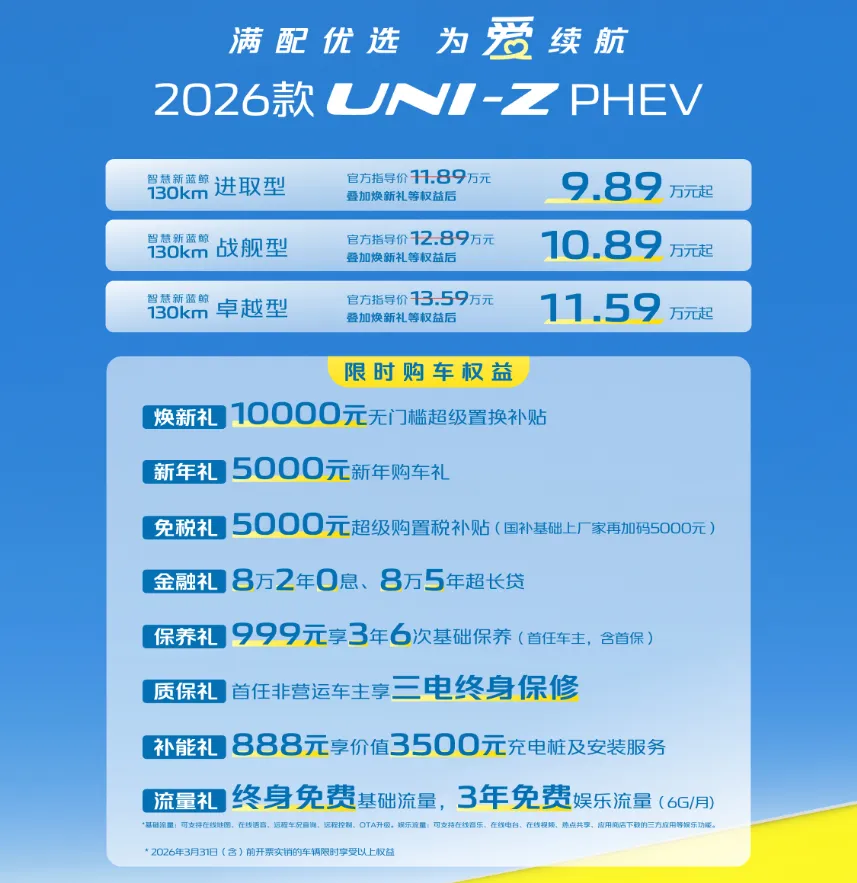 综合来看,2026款UNI-Z PHEV肯定是符合三个核心配置的要求的。当然,这个预算很多人肯定还会纠结比亚迪宋L DM-i还有吉利银河星舰7。核心指标上三辆车没有太大差距,也说明这个级别的竞争有多激烈。