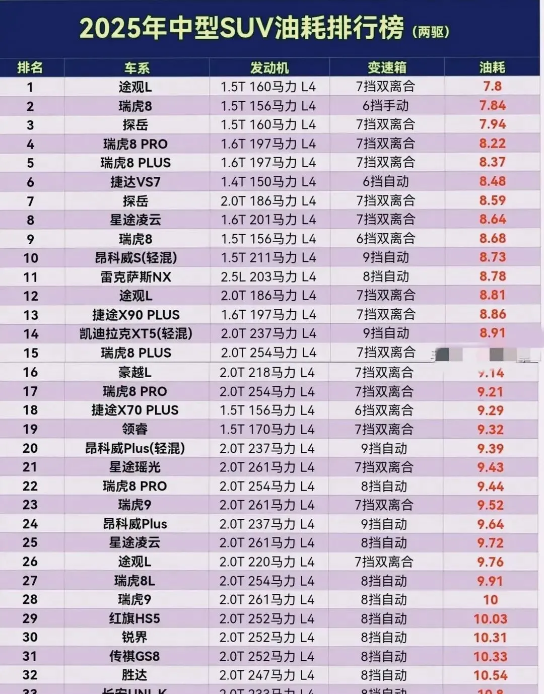 部分搭载8AT双离合与7挡双离合的车型(尤其是大众系和奇瑞系调校)在传动效率上表现较为突出,帮助取得了较低的油耗。但也有部分2.0T配合8AT的车型(如瑞虎9、红旗HS5、传祺GS8),由于动力更强、车重更大,百公里油耗普遍进入9升俱乐部。此外、在榜单后段第29名里面的2.0T车型里面,如红旗HS5、锐界、传祺GS8、胜达等,油耗普遍超过10L。 如果必须选2.0T,可以参考瑞虎8PLUS 2.0T、星途瑶光等。但需要做好心理准备,市区拥堵路况下,这些车的油耗可能会比榜单数值更高。