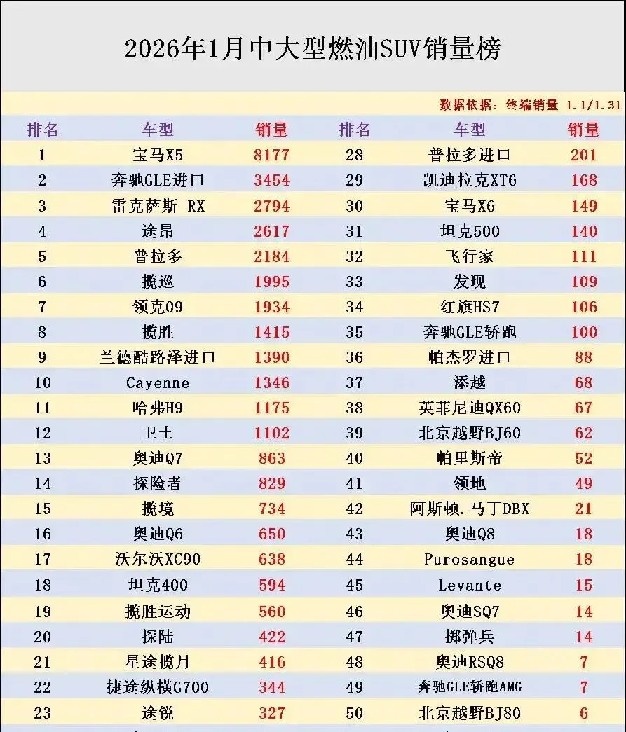 看到乘联会最新数据时,我正喝着冰可乐,直接呛出眼泪。新能源车铺天盖地刷屏,朋友圈全是“电车才是未来”。可1月燃油SUV销量榜单一出,我反手就把手机摔在沙发上:12款车月销破千,宝马X5稳坐第一,销量1995辆往上,雷克萨斯RX、普拉多、揽巡全在1995+,直接杀进前六。领克091934辆排第7,哈弗H91175辆第11,卫士1102辆第12——这些数字不是P图,是真金白银的销量。
