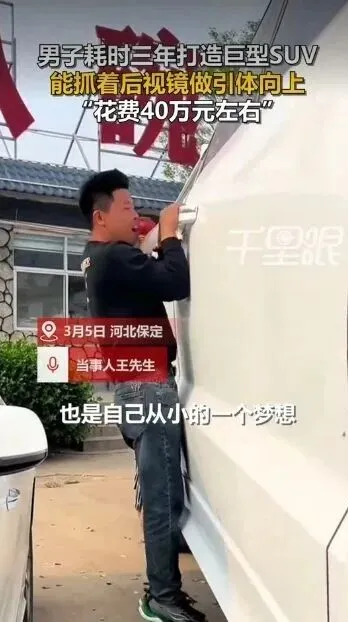 今年3月,河北省保定市唐县 44 岁修车师傅王全中的 “巨车梦” 再度引发全网热议。继耗时三年打造的巨型 SUV 走红后,他的新作巨型三轮车同样吸睛,而那辆花费近 40 万元、能让人抓着后视镜悬空做引体向上的巨型 SUV,更是用匠心诠释了平凡人的极致热爱。