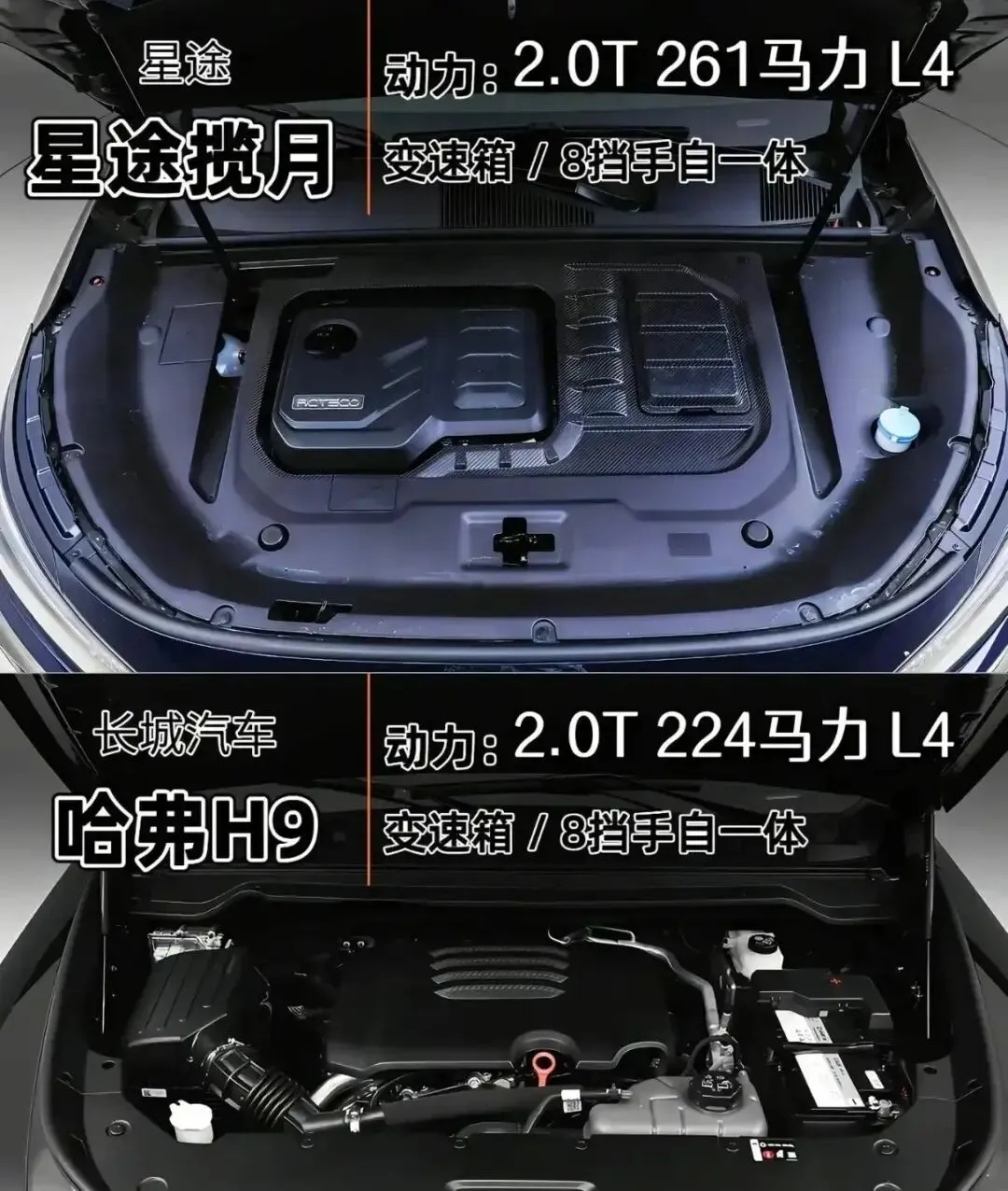 星途揽月2.0T 261马力,油耗8.98L/100km,整备质量1920kg,开起来轻快得像溜冰。哈弗H92.0T 224马力,油耗10.7L,整备质量2330kg——重了410公斤!