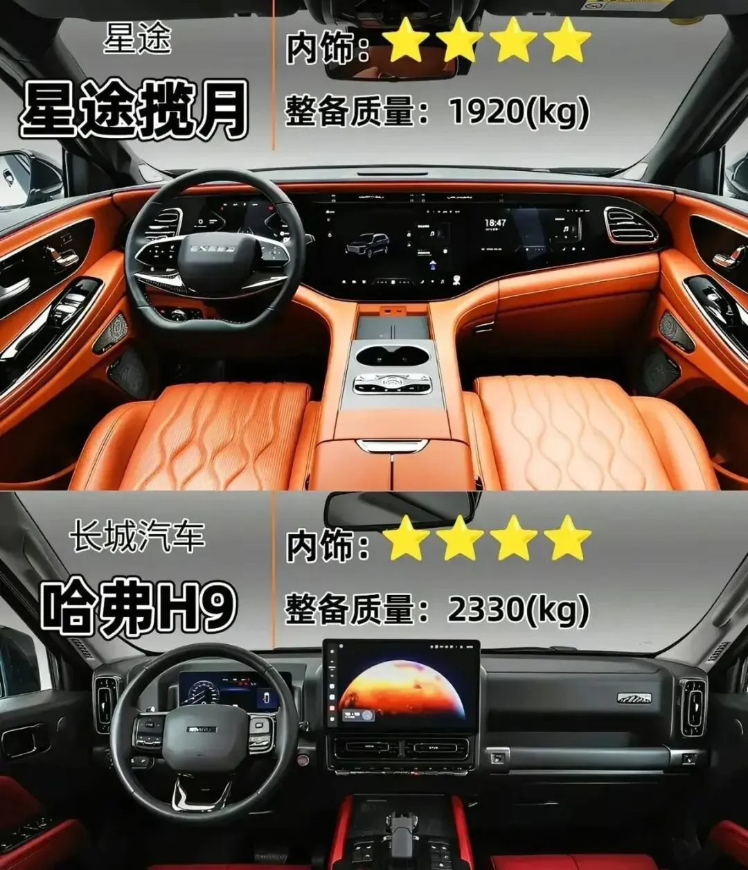 星途揽月用橙色皮质缝线,双联屏+怀挡,坐进去秒变豪华商务座舱。哈弗H9红黑内饰配大屏+物理按键,硬朗是硬朗,但手指一摸全是油渍——开久了像在修车厂。