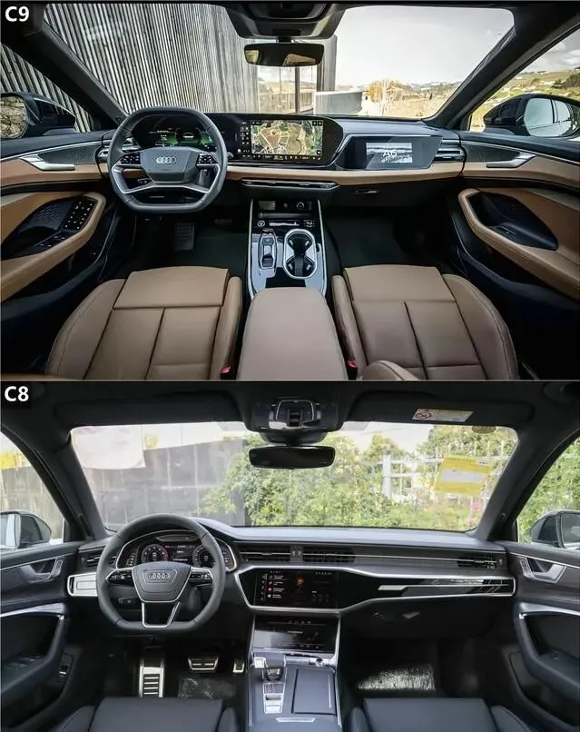 内饰升级是第九代A6L的另一大亮点。四屏联动:12.3英寸仪表+14.1英寸中控屏+10.8英寸副驾屏+8.6英寸空调屏,视觉冲击力十足。整体材质上,可再生桉木饰板和铝制拉丝面板拼接,科技感与环保感兼顾。说实话,这套内饰比C8有范儿,但创新感有限,因为A5L和Q6L e-tron早就铺开四屏方案。如果追求独特感,C8的内饰设计仍然耐看。