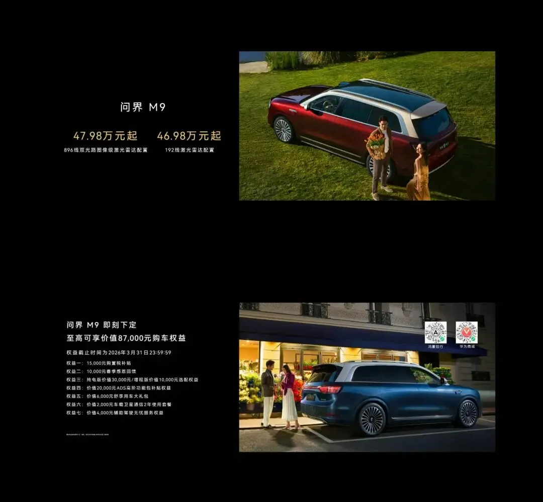 在50万级豪华智能SUV市场,2026款问界M9凭借华为深度赋能,完成了从设计、智驾、动力到座舱体验的系统性升级,增程与纯电双线并行,还提供五/六/四座多元布局,精准覆盖高端家庭与商务用户的需求。
