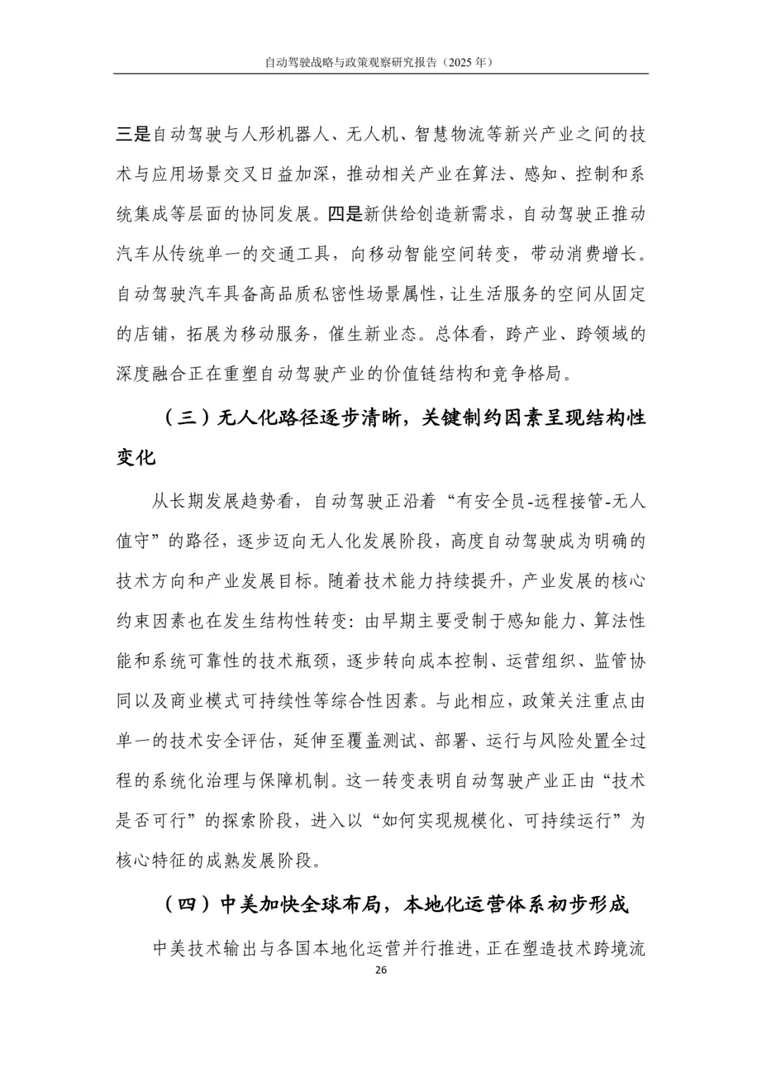 对于中长期发展,报告展望四大趋势:规模化商用加速普及,应用体系从“可用性验证”转向“可复制、可扩展”;产业生态持续拓展,汽车与AI、ICT等深度融合,车路云一体化及跨产业协同深化;无人化路径清晰,关键制约从技术瓶颈转向成本、运营、监管等综合因素;中美加快全球布局,形成“技术输出+本地运营”模式,本地化体系初步建立。
