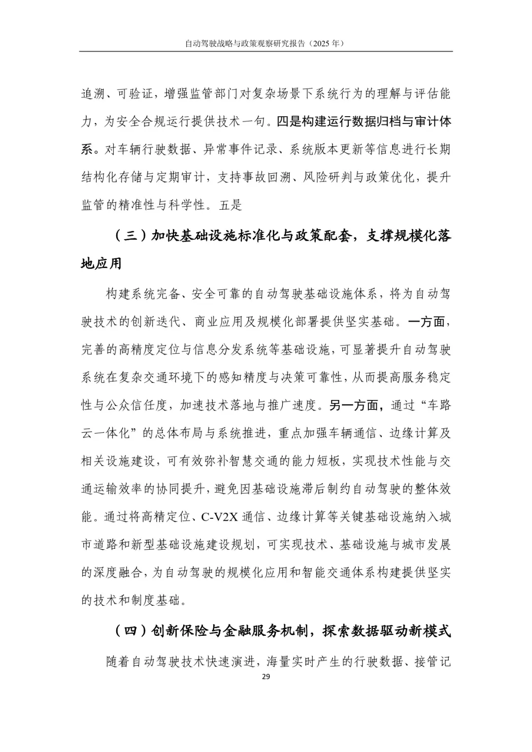 最后,报告针对现存挑战(治理能力匹配不足、制度供给难撑规模化、基础设施协同待强、保险金融规则缺失)提出四点建议:构建系统协同的监管体系(统一标准、动态评估、明确能力等级);完善数据治理与安全制度(云控平台准入、全生命周期保护、算法透明、数据归档审计);加快基础设施标准化与政策配套(高精定位、C-V2X、边缘计算等纳入新基建);创新保险与金融服务机制(数据驱动风险评估、适配商业模式金融工具)。
