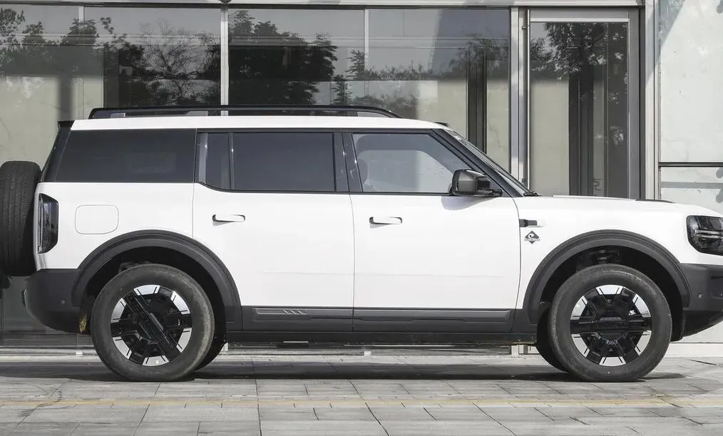先说说外观吧,这个车它还是保持了那种方盒子的造型 ,就是特别特别硬朗的那种感觉。你看它这个侧面,引擎盖车顶包括侧裙,全都是笔直笔直的线条,然后车长超过5米,高度也有1米9多,这个尺寸在中型SUV里边算是比较大的一个存在了。轮圈我看了一下,选的也挺漂亮,宽辐条还搭配了方块式的镀铬,看着就很结实。