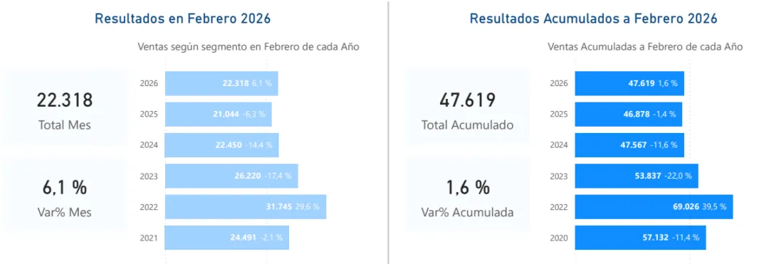 2026年2月智利新车销量同比增长6.1%为22,318辆(不含重型卡车和客车),1-2月累计销量同比增长1.6%至47,619辆。