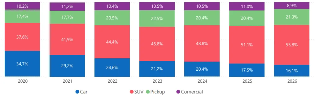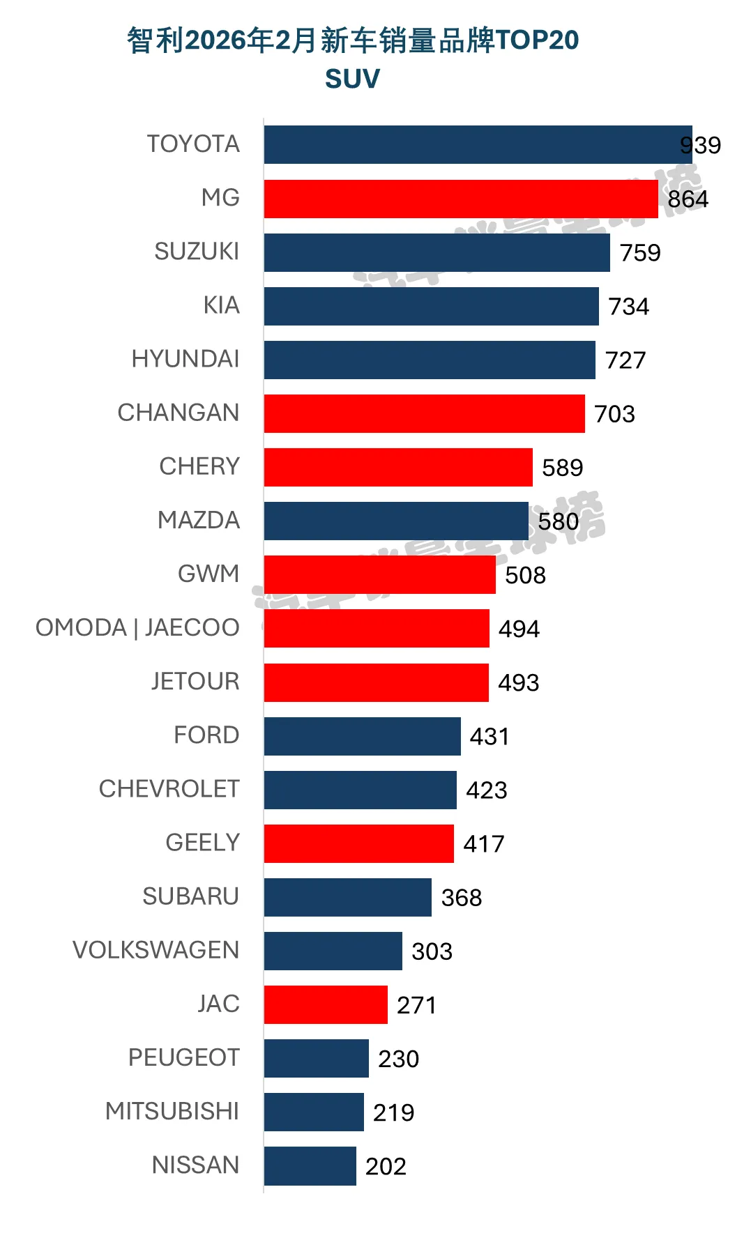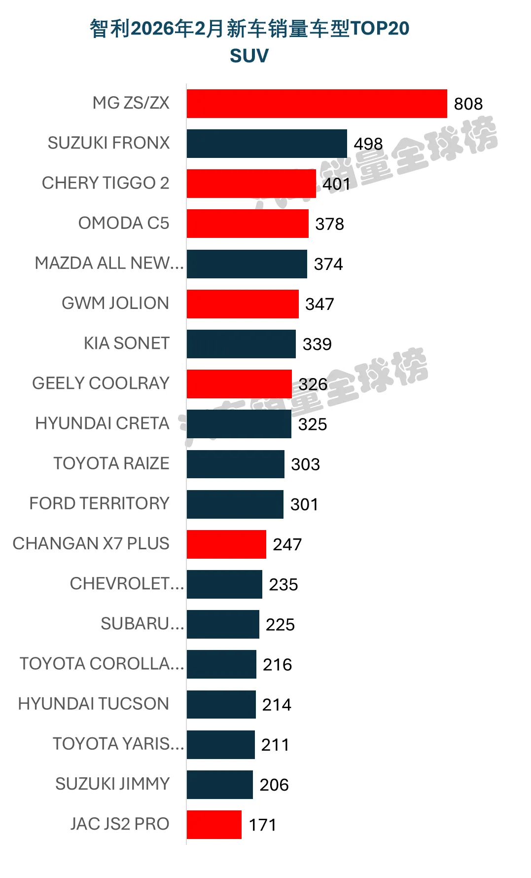 智利2026年1月新车销量微降2.1%为2.5万辆,名爵ZS遥遥领先成为智利消费者最喜欢的SUV车型