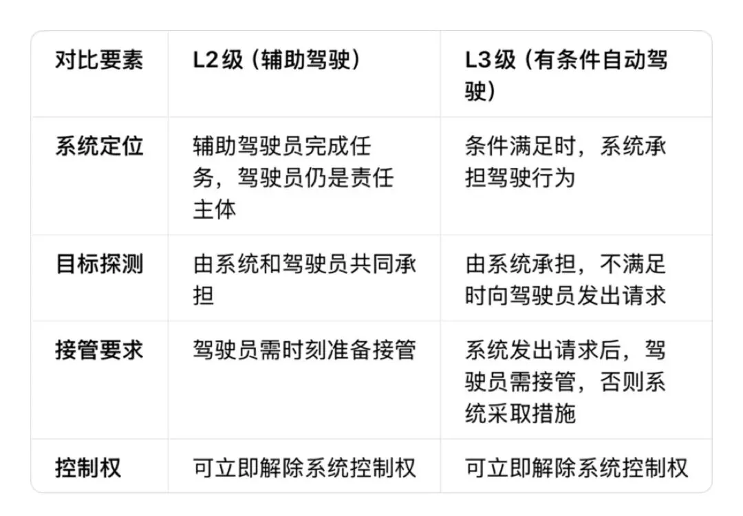 • 自动驾驶(L3及以上):在满足条件的场景下,责任主体转移到了系统。