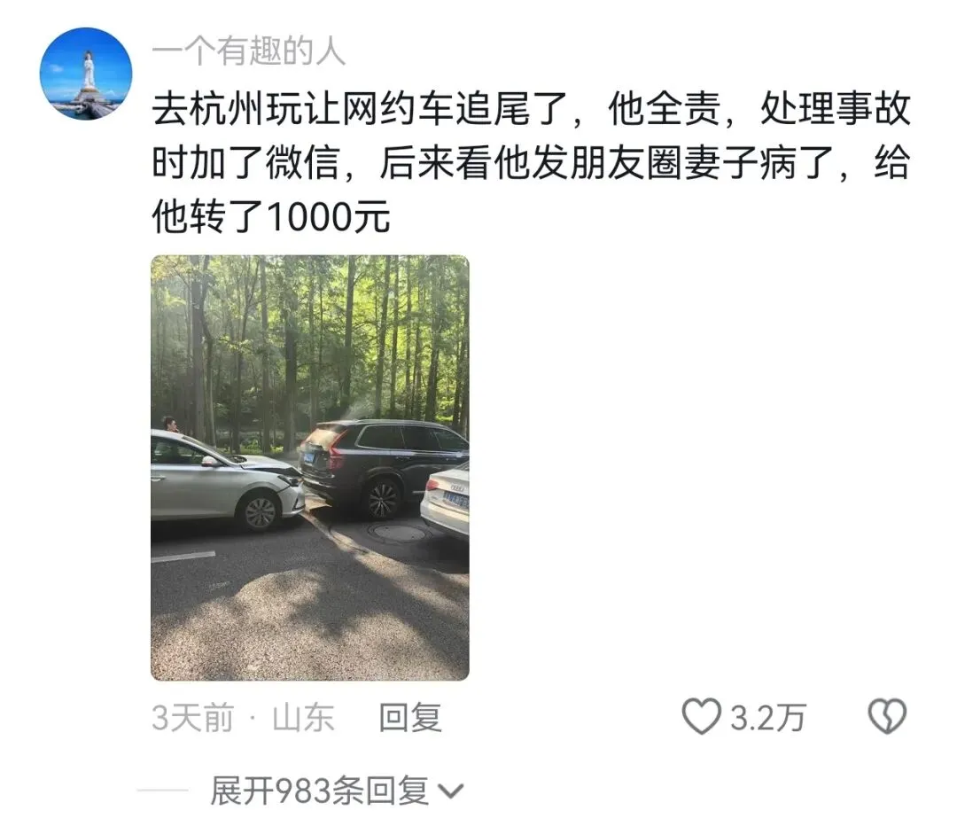 今天,记者再联系到张先生。张先生的车正待维修,“车尾一个雷达撞坏了,修理厂要等配件到货,(换一下)几千块钱。”前些天,张先生把这段行车记录视频发到了自己的社交账号,没想到短短几天就火了,吸引了全网千万网友点赞与评论。张先生说,本来这是件倒霉事儿,但当时小哥说出能不能先赔偿自己400元钱的时候,他心里一下子就酸了。“当时他要送的单子撒在地上,一共三份外卖,水饺、鲜花之类的,估计也得赔个一两百块吧?我想到如果这是我的弟弟,碰到这种情况,我心里会怎么想?我把1000元红包塞给他的时候,他推脱了好一会儿。”“这是很微不足道的一件小事而已。没想到它居然火了,可能还是我们每个人心中都有一份善意吧。”视频火了之后,也有热心网友当起了“侦探”,发现这位张先生是个有趣的单身小伙。比如,过年期间,他去寺里求姻缘却发现寺庙没开门,他找遍全寺找到住持来开门。有网友纷纷为他助力相亲:“把我妹介绍给你吧。”“哥结婚了没,没结婚把我姐介绍给你。”“谈吗?”“不知道为什么,这事儿把我带到一个相亲的方向去了。”张先生笑了,“感谢大家,可能觉得我是一个好人,欢迎大家和我做朋友。”更让张先生觉得感动的是,他的“凌晨被追尾”这事就像一颗投进湖里的小石子,泛起阵阵涟漪,许多网友在评论区分享了自己曾在杭州的碰到过的暖心事,看下来,就像一幕幕电影场景。张先生很有感触,“我对杭州的印象一直很好。这里的人很热情,拿一个很小的事来说,你如果问路,不远的话,杭州人会直接把你领着,带你到目的地去。”张先生也想着,今后有机会把上海的事业搬到杭州来,“因为这几年接触下来,我觉得这座城市的创业、营商、生活的氛围,非常棒。”人有时候可以善良到什么程度呢?这是张先生的评论区里,来自全国各地IP的真实经历: