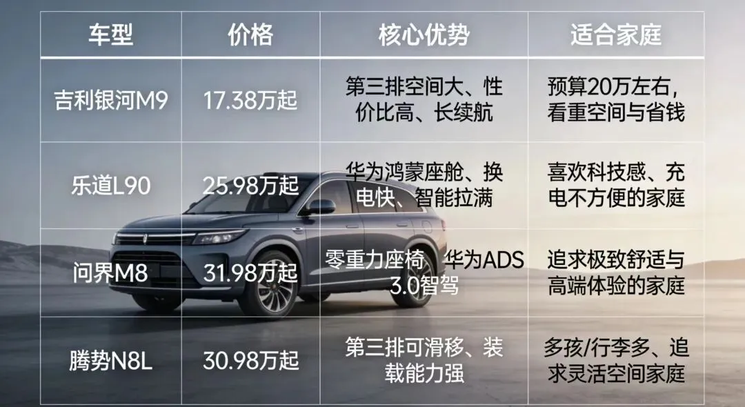 对六口之家来说,新能源SUV的核心需求永远是“全家坐得下、长途跑得远、坐着够舒服”。吉利银河M9用17万的价格给了30万级的空间,适合预算有限的家庭;乐道L90靠华为智能和换电补能,打动年轻科技家庭;问界M8的二排零重力座椅和高阶智驾,是追求舒适的首选;腾势N8L的灵活空间,则完美解决“人多行李也多”的难题。