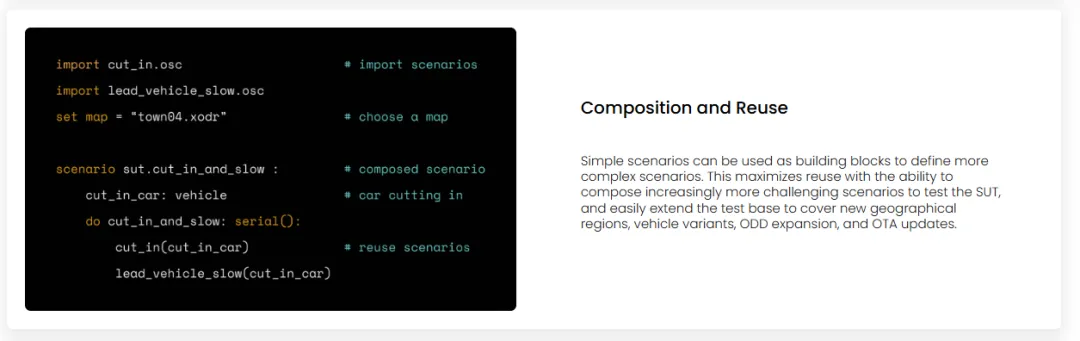 组合场景声明:声明场景的逻辑关系,比如parallel(overlap: equal): 自车沿r1行驶、其他车辆沿r2行驶,无需处理多线程逻辑。