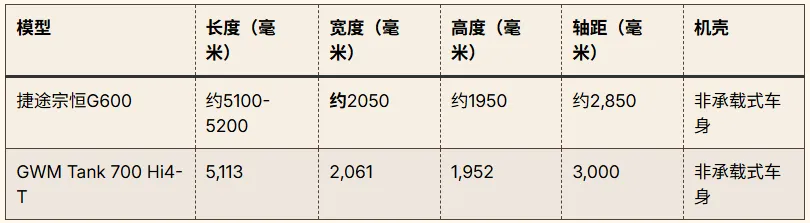 捷途纵横G600进军全尺寸豪华越野车市场,其特点是注重先进的混合动力技术、高离地间隙、硬朗的设计风格以及高档的内饰材质,旨在吸引城市和越野爱好者。这使其与长城坦克700 Hi4-T展开直接竞争,后者起售价为42.8万元人民币(约合6.2万美元)。捷途预计到2025年全球销量将达到62.259万辆,为品牌向高端市场转型奠定基础。