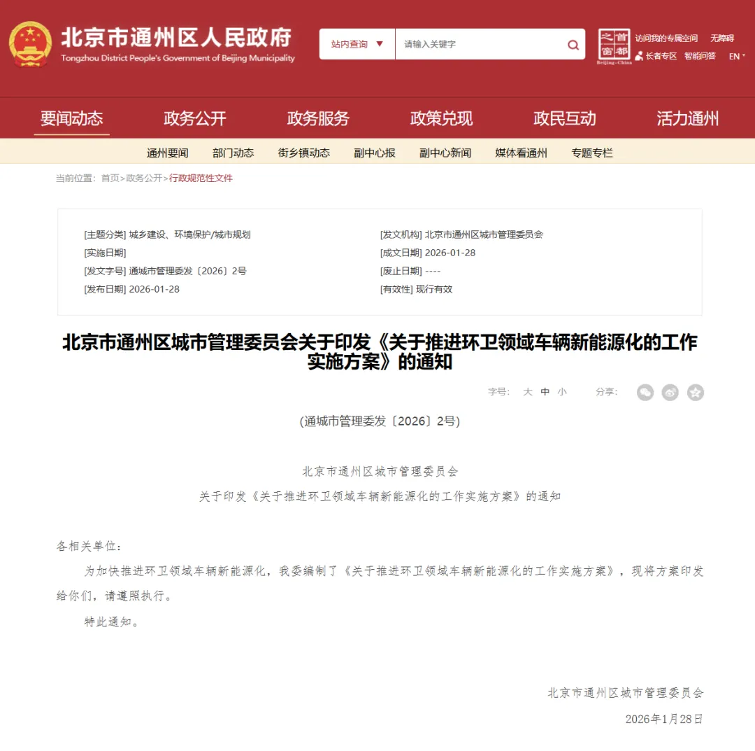 2026年1月北京市通州区发布《关于推进环卫领域车辆新能源化的工作实施方案》的工作目标中指出2026-2027年在自动驾驶示范区3.0道路试点开展环卫新能源车无人驾驶;利用市级信息化系统平台强化车辆日常监管。2028-2030年在环卫领域基本实现新能源车辆全面应用新格局,并具备布局合理、适度超前、车桩相随、智能高效的环卫充电体系,形成有技术、示范性强的应用作业场景,部分路段实现无人作业。