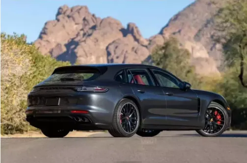 车尾部分,保时捷K1采用溜背式猎装造型,尾部线条简洁流畅,搭配贯穿式LED尾灯,点亮后视觉效果出众,夜间辨识度极高。尾灯下方的黑色装饰条与车头进气格栅形成呼应,进一步提升了整车的整体性与精致感。隐藏式排气布局简约低调,却难掩其狂暴性能,而双边共四出的排气装饰件,巧妙增添了一丝运动氛围,兼顾了豪华感与运动感,完美契合猎装SUV的定位。