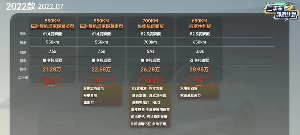 2022款的各种配置和价格,包括标准续航后驱精英型、标准续航后驱尊贵型和长续航后驱版。”