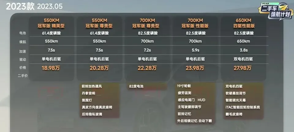 2023款的各种配置和价格,包括冠军版精英型、冠军版尊贵型和冠军版尊贵型。”
