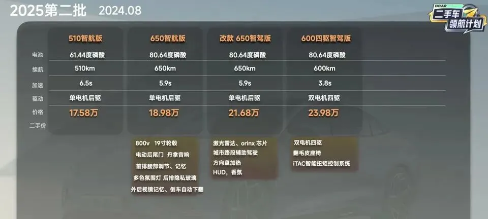 2025款的各种配置和价格,包括510标准版、650智航版、改款650智驾版和600四驱智驾版。”