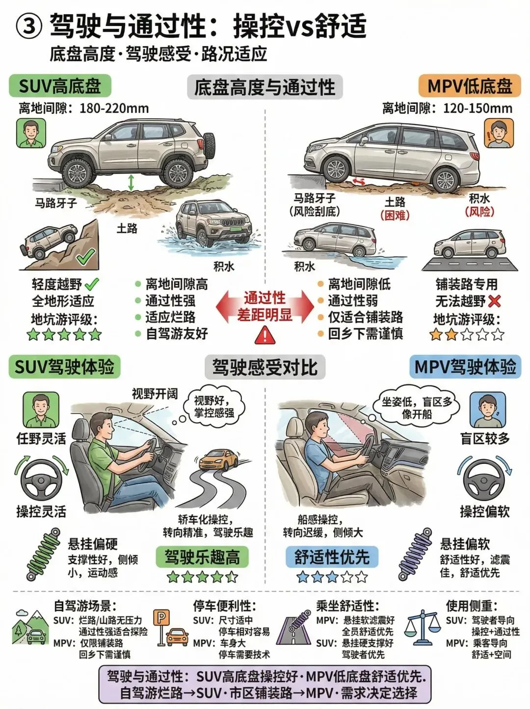 - MPV 优势:底盘较低 120–150mm,悬挂偏软,乘坐更舒服,但通过性一般,回老家、过积水路段要小心。