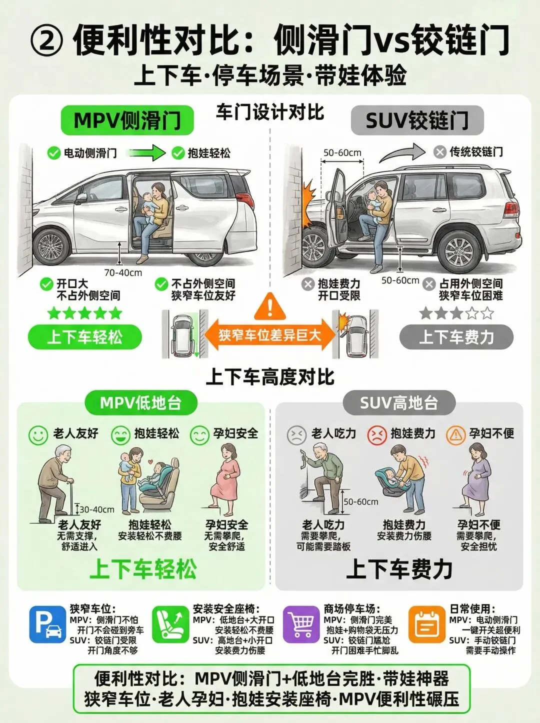 - 停车场景:狭窄车位里,MPV 侧滑门开门不占空间;SUV 铰链门开门角度受限,抱娃上下车很不方便。