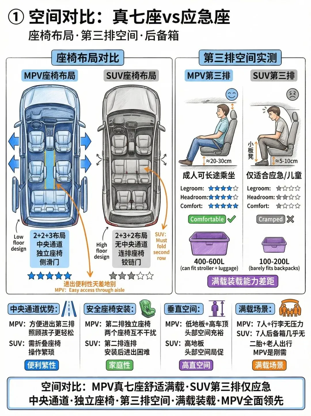 空间/便利性/驾驶/选购全对比:MPV 真七座 vs SUV 应急七座