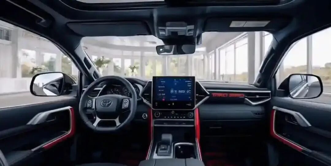 内饰方面,全新丰田红杉 TRD Pro 采用了实用化的座舱设计,中控台大面积软质材料包裹,搭配红黑拼接带 TRD 刺绣的座椅,翻毛皮材质质感在线,实体按键布局清晰,盲操作十分便捷,14 英寸中控屏搭载丰田最新车机系统,支持无线 CarPlay 与 360 度全景影像,标配 14 扬声器 JBL 音响,日常使用体验出色。只是内饰豪华感不足,相比同价位豪华 SUV 质感略有差距。