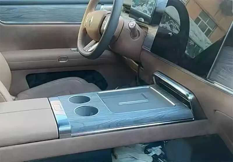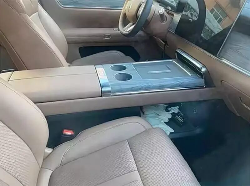 内饰部分,华境S兼顾科技感与实用性。车内配备液晶仪表盘与大尺寸悬浮式中控屏,车机系统由华为全权负责,功能表现与鸿蒙智行旗下车型基本一致,操作流畅、功能丰富,能带来出色的智能交互体验。前排地台采用上下双层设计,下层是大容量储物格并配备充电接口,满足日常储物与充电需求;上层设有两块手机无线充电面板和两个独立杯架,细节贴心。车内未看到传统换挡机构,推测采用电子怀挡设计,布局在方向盘右侧底部,进一步简化中控台布局。