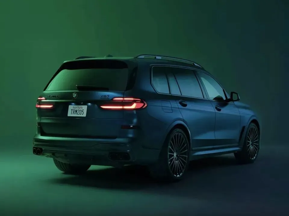 车身侧面线条大气舒展,配备23英寸ALPINA CLASSIC 20辐锻造轮圈,采用亮黑色处理,搭配黑色ALPINA经典双线条贴花,进一步凸显曜夜套装的专属气质;车窗边框、翼子板装饰均为亮黑色,B柱位置设有激光蚀刻的“MANUFAKTUR”标识,低调彰显其特殊定位。车尾配备贯穿式LED尾灯,尾部排气装饰采用亮黑色涂装,搭配专属“XB7 MANUFAKTUR”徽章,整体设计与前脸呼应,尽显高端性能SUV的气场。