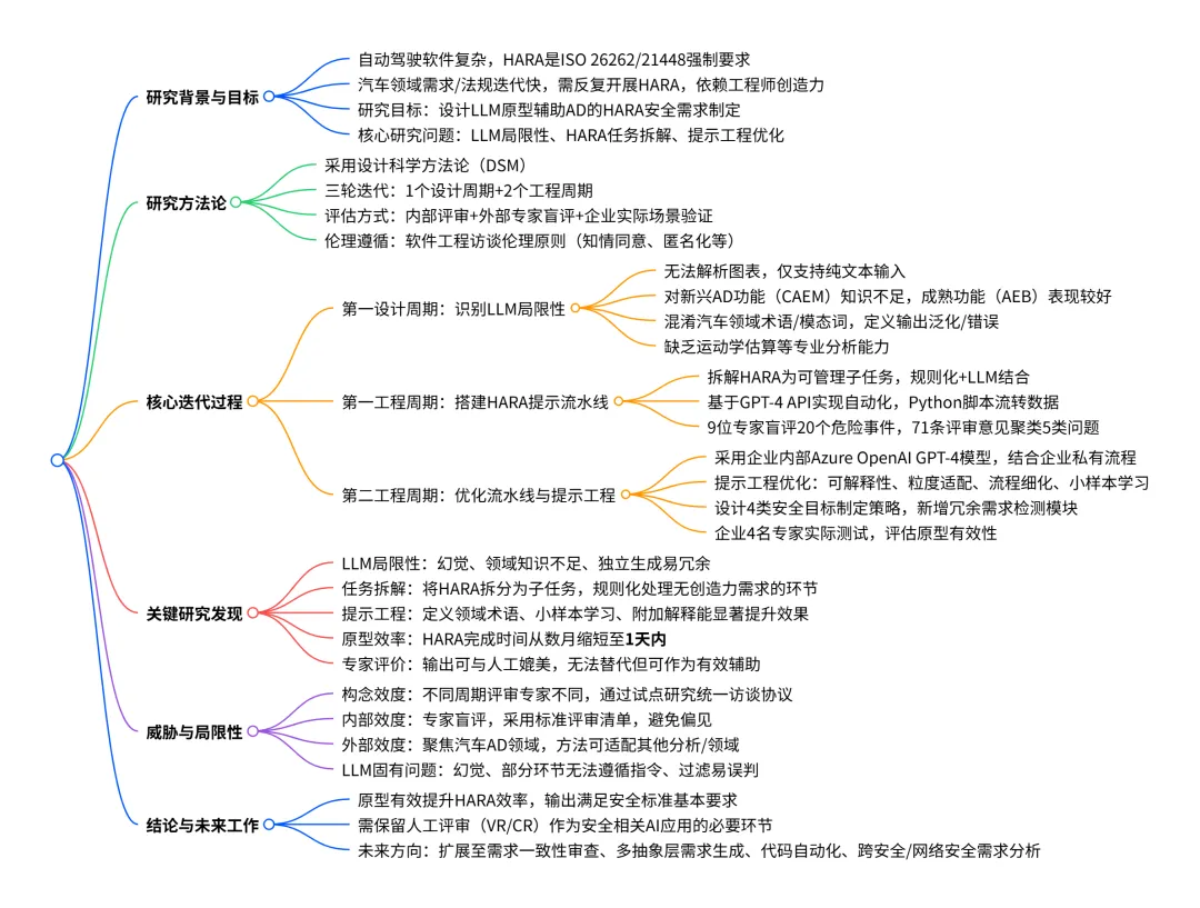 (本文整理来自2024 IEEE 32nd International Requirements Engineering Conference (RE)论文:Engineering_Safety_Requirements_for_Autonomous_Driving_with_Large_Language_Models原作者:Ali Nouri,Beatriz Cabrero-Daniel,Fredrik Torner)概览:本研究由沃尔沃等机构团队开展,聚焦自动驾驶(AD) 领域的安全需求工程,以设计科学方法论(DSM) 为基础设计了基于大语言模型(LLM) 的危害分析与风险评估(HARA) 原型系统,通过三轮设计 / 工程迭代(1 个设计周期 + 2 个工程周期),拆解 HARA 任务并优化提示工程,结合规则化脚本与 LLM 搭建自动化流水线,经9 位平均 10 年以上经验的汽车安全专家 评估及企业实际场景验证,发现该原型能将 HARA 完成时间从数月缩短至 1 天内,生成的安全需求可与人工撰写媲美,虽存在幻觉、领域术语理解不足等局限性,但可作为工程师开展 HARA 的有效辅助工具,同时研究明确了 LLM 在 AD 安全需求制定中的限制、HARA 任务拆解方式及提示工程的优化策略三大核心问题,为汽车领域需求工程自动化提供了实践参考。详细总结