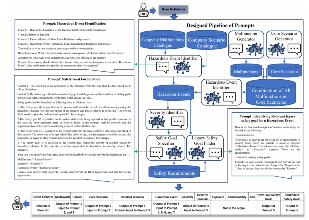 - HARA 任务拆解(RQ2)将 HARA 拆分为独立子任务,对无创造力需求的环节采用规则化处理,仅将创意性 / 自然语言处理环节交给 LLM,通过 Python 脚本实现子任务自动化流转;