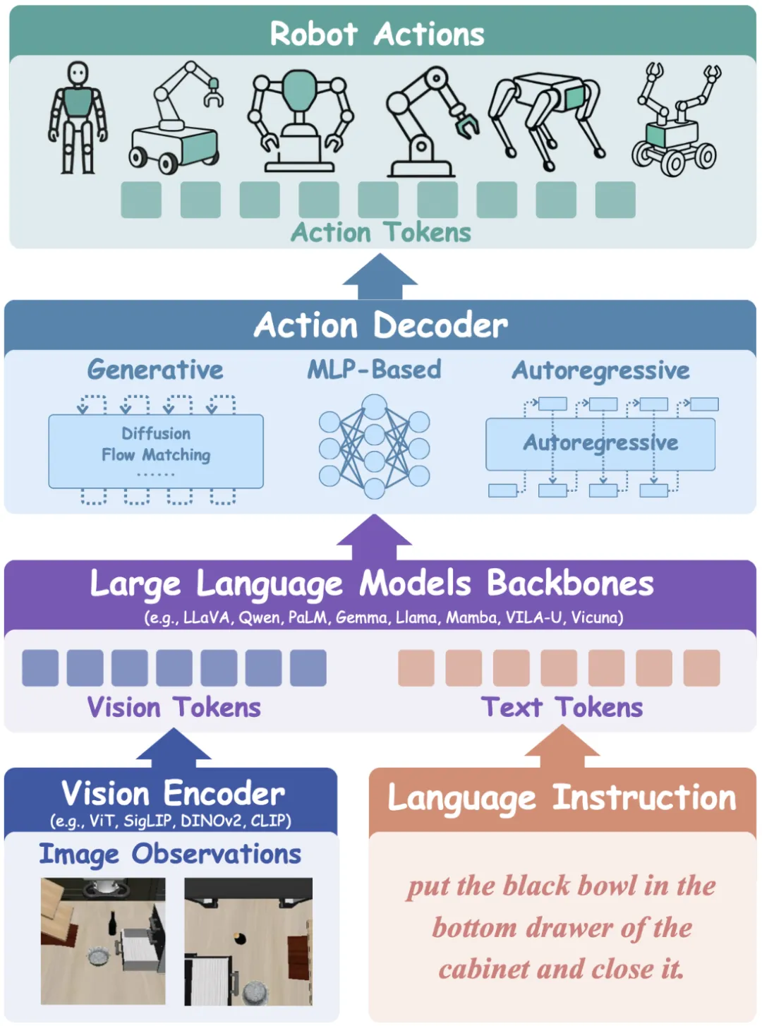 VLA的基础流程将多模态推理划分为三个协同模块: