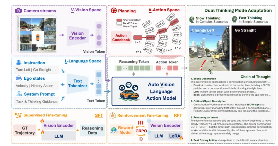 图片来源:论文《AutoVLA: A Vision-Language-Action Model for End-to-End Autonomous Driving with Adaptive Reasoning and Reinforcement Fine-Tuning》
