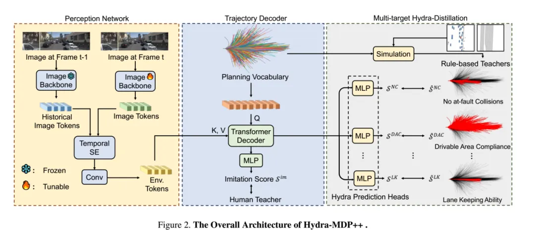 Hydra-MDP++不是VLA,可以看做传统端到端,核心在于后段的轨迹词汇表,英伟达构建了一个固定的规划词汇表planning vocabulary来离散化连续的动作空间。为了构建词汇表,英伟达首先从原始的nuPlan数据库中随机抽取了700K条轨迹。每条轨迹Ti(i = 1,..., k)由40个时间戳的(x, y, heading)组成,对应于挑战中所需的10Hz频率和4秒的未来时间范围。规划词汇表Vk是通过700K条轨迹的K-means聚类中心形成的,其中k表示词汇表的大小。然后,Vk被嵌入为k个潜在查询,通过多层感知机(MLP)发送到转换器编码器层,并添加到自身状态E中。