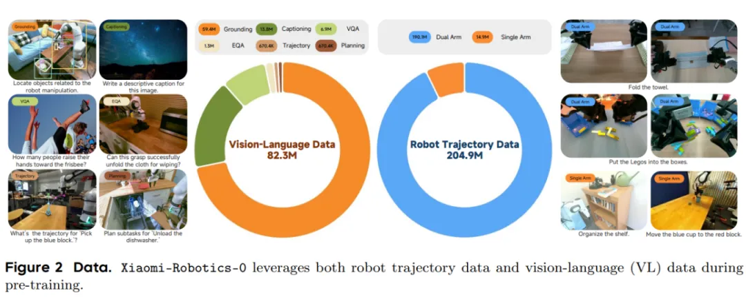 二者均摒弃单一的机器人轨迹数据训练方式,采用多源数据融合的训练策略:同时利用大规模通用视觉-语言数据(保留语义知识)、跨载体机器人轨迹数据(提升动作生成能力),字节GR-3 还进一步融入了人类 VR 轨迹数据(实现少样本快速适配),小米则针对特定任务收集了大规模自研遥操作轨迹数据(提升细分任务性能),均通过数据多样性解决泛化性不足的问题。