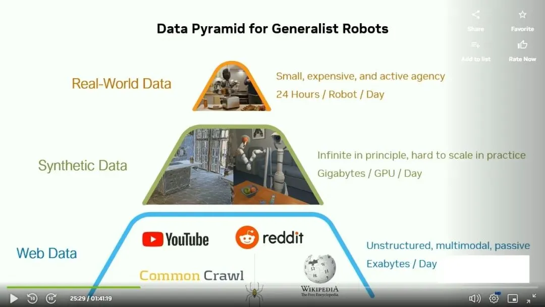 上图是英伟达GTC2025大会An Introduction to Building Humanoid Robots演讲截图,数据分真实世界、合成数据和网络数据三大类。需要指出这里的网络数据主要是用来训练VLM或LLM,具身智能企业都是直接采用大型科技公司的VLM或LLM,如阿里的Qwen或谷歌的Gemma,也有使用人类示范视频数据,但这类数据缺点明显,首先是在重建状态 s 和动作 a 时存在巨大的时间差距,难以建立强关联。其次动作必须完全从原始数据中推断,通常需要借助其他模型进行伪标注(例如人体骨骼追踪、手部追踪),这可能比真实机器人数据成本还要高。最后人类会通过身体前倾、重心转移、伸展身体来完成动作,人类的自由度远超顶级机器人。对具身智能企业来说,真实机器人数据是最有价值的。