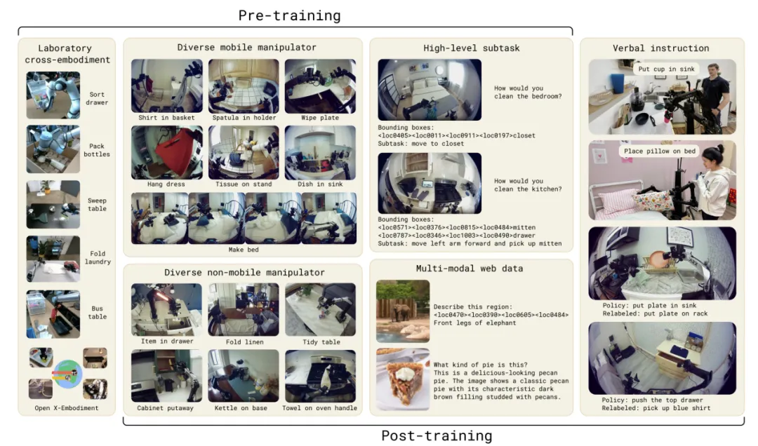 数据包括Diverse Mobile Manipulator data (MM),约400小时的移动机械臂数据,涵盖了约100个不同家庭环境中的家务任务,是最核心数据。Diverse Multi-Environment non-mobile robot data (ME)是非移动机器人的数据,这些机器人可能是单臂或双臂,被固定在桌面或其他平台上。Cross-Embodiment laboratory data (CE)跨形态实验室数据,涵盖多种任务(如收拾餐具、叠衣服等)的数据,环境更为简单,机器人类型多样,包括单臂、双臂、静态和移动底座。有些任务与评测高度相关(如将餐具放入收纳箱),有些则无关(如研磨咖啡豆)。此外还包含了开源 OXE 数据集。Multi-modal Web Data (WD)引入了多样化的网络数据,包括图像描述、问答和目标定位等任务。目标定位部分还扩展了标准数据集,补充了更多室内场景和家庭物体的边界框标注。