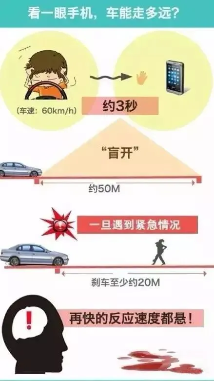 当机动车车速达到 60 km/h,每秒钟行驶16.7 米,你低头看 2s 手机,相当于忙开了 32 米 ;如果车速更快,或者浏览手机时间更长,留给你反应的时间越来越少,极有可能酿成惨剧。