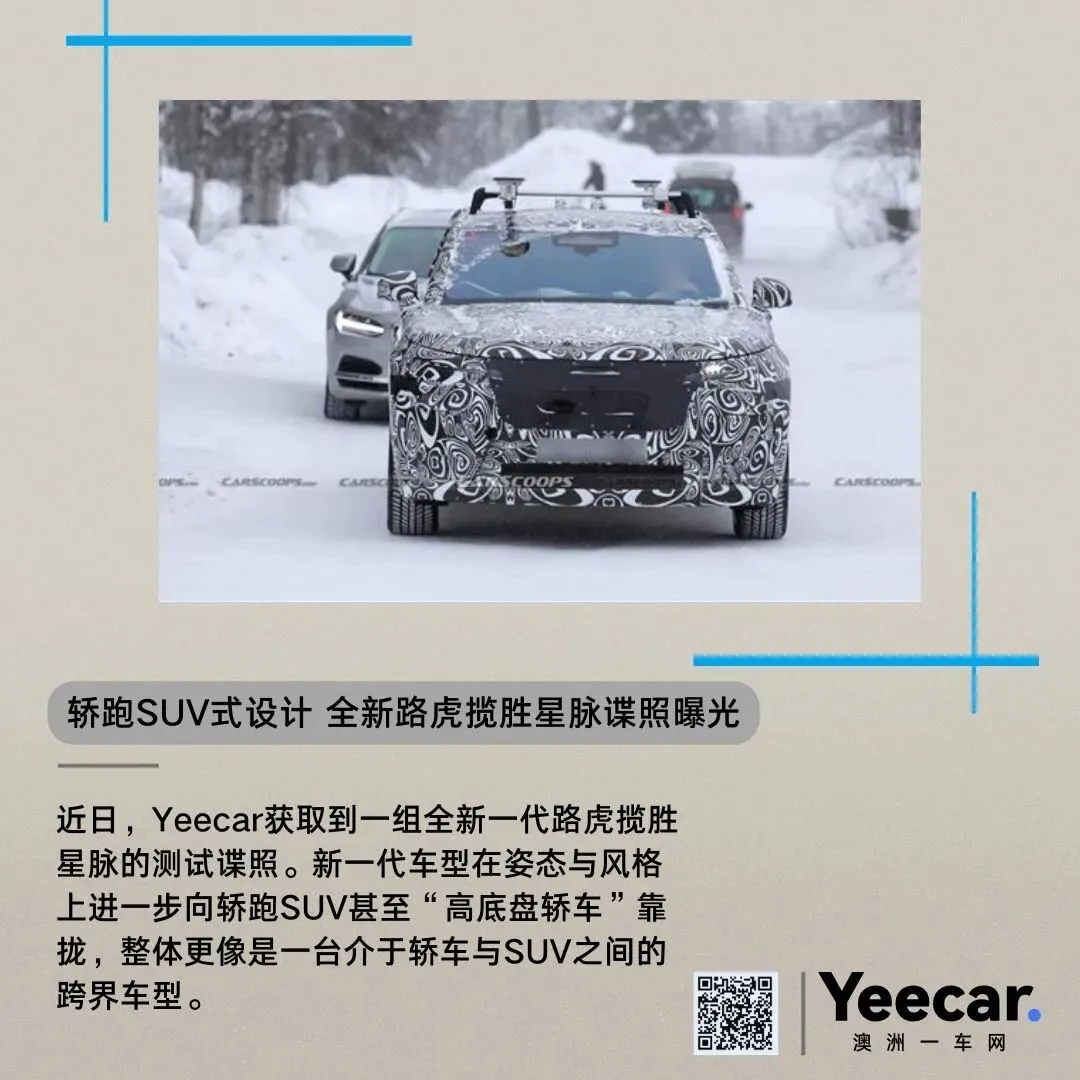 近日,Yeecar获取到一组全新一代路虎揽胜星脉的测试谍照。作为路虎体系中最强调“优雅与时尚”的SUV产品,星脉一直以运动化、设计感见长。而从此次曝光的原型车来看,新一代车型在姿态与风格上进一步向轿跑SUV甚至“高底盘轿车”靠拢,整体更像是一台介于轿车与SUV之间的跨界车型,而非传统意义上的SUV。