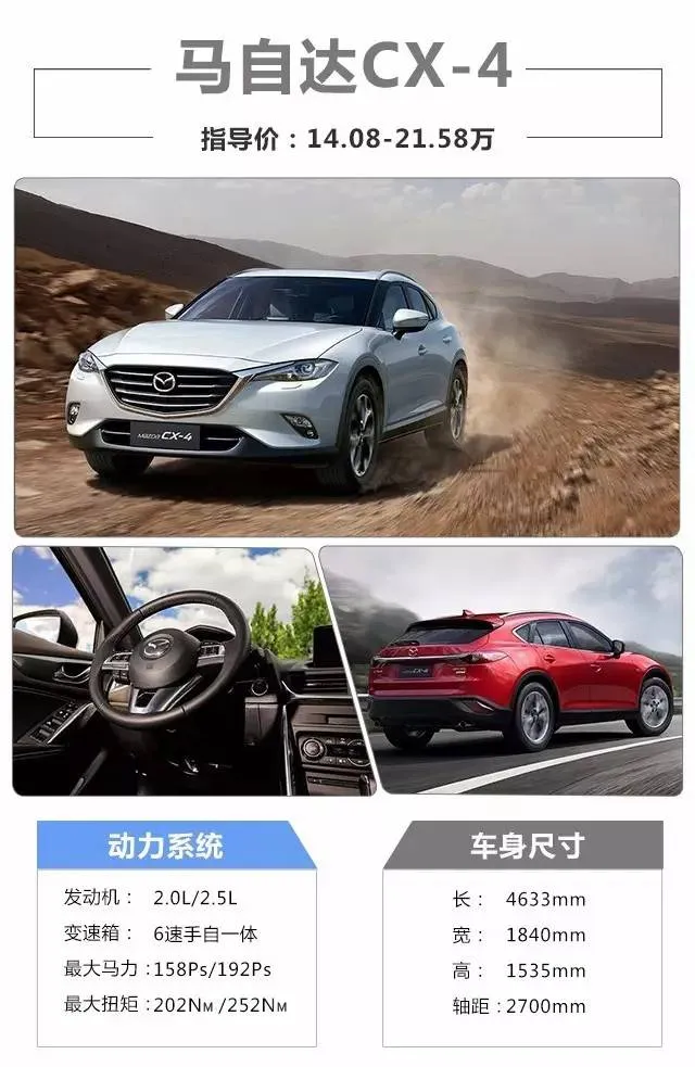 而新推出的CX-4在各方面都非常优秀,14万多的起售价,在同级别看来也极具性价比,但是在大多数竞争对手都纷纷搭载涡轮发动机时,马自达仍采用自吸发动机,虽然创驰蓝天的技术使它油耗表现尚可,但是在动力性能上依旧是短板,这也是他卖不好的一个原因吧!