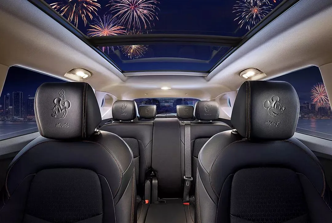 从外还有显示出米奇定制版的专属icon,发掘它们就像是“找彩蛋”一样,车身镀铬饰条、前格栅、后尾门,又甚至打开门后的投影灯、发光迎宾踏板,中控屏幕的启动界面等,都可以发现这无处不在的米奇,在不经意间逗你一笑。