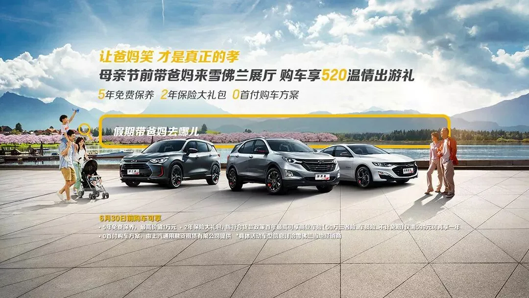 在父亲节以及母亲节前夕,雪佛兰推出了“雪佛兰520购车礼”活动,活动时间至6月30日截止。“让爸妈笑,才是真正的孝”,这一主题让人觉得非常温馨,“520”谐音正正是“我爱你”,该主打温情牌的活动将人、汽车以及生活真正地融合在一起。